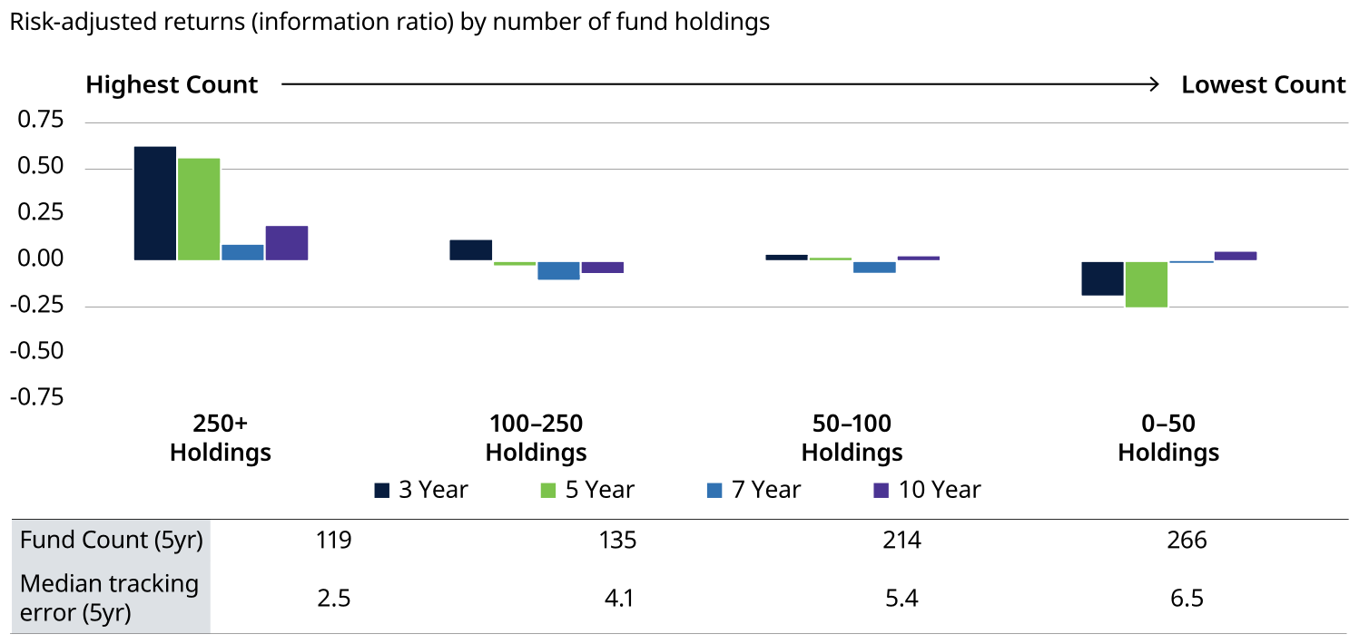 In het algemeen wordt vaak gedacht dat geconcentreerde portefeuilles correleren met hogere ‘excess returns’, aangezien de omvang van de positie synoniem is met overtuiging. De afgelopen tien jaar was echter juist het tegenovergestelde waar: portefeuilles met de meeste posities – 250 of meer – presteerden aanzienlijk beter dan meer geconcentreerde strategieën op basis van voor risico gecorrigeerde rendementen.