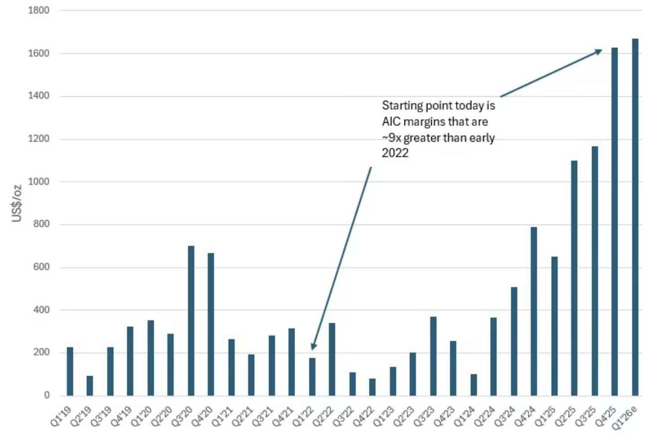Het grote verschil met 2022 is echter het vertrekpunt van de marges van producenten. Op all-in-basis - dus inclusief totale kosten, groeikapitaal en contante belastingen - lagen die marges bij het begin van dit conflict ongeveer tien keer zo hoog als bij de start van de oorlog tussen Rusland en Oekraïne: circa $150 per ounce begin 2022, tegenover ongeveer $1.800 per ounce nu, zoals ook blijkt uit de onderstaande grafiek.