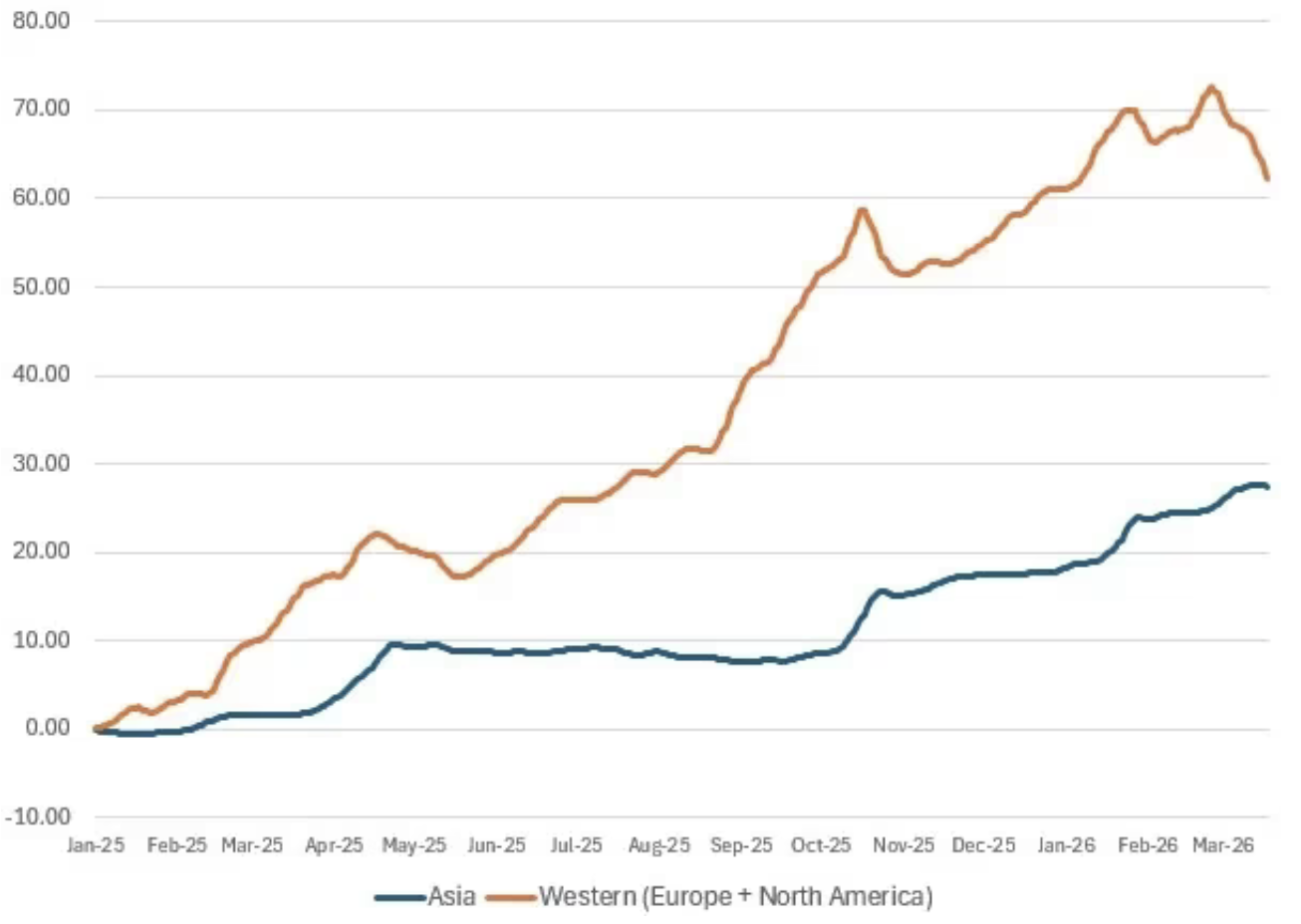 Opvallend is het scherpe contrast tussen de verkoopdruk in westerse markten en de veel stabielere vraag in China. Dat is goed zichtbaar in de afbeelding hieronder, die de instroom in fysieke goud-ETF’s in Europa en Noord-Amerika afzet tegen die in Azië sinds begin 2025.