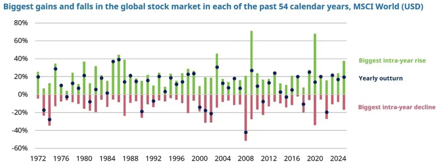 Past performance is not a guide to the future and may not be repeated. Data 1972-2025 for MSCI World price index in USD terms. Bars shows the biggest peak-to-trough fall and trough-to-peak rise in the price index in each calendar year. Source: LSEG Datastream, MSCI, and Schroders.
