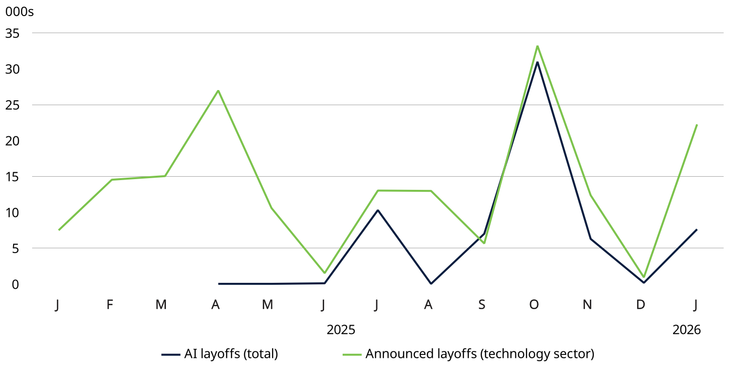 Bron: OECD, Schroders Economics Group. 25 februari 2026 Source: Challenger, Gray and Christmas, Schroders Economics Group. 25 februari 2026