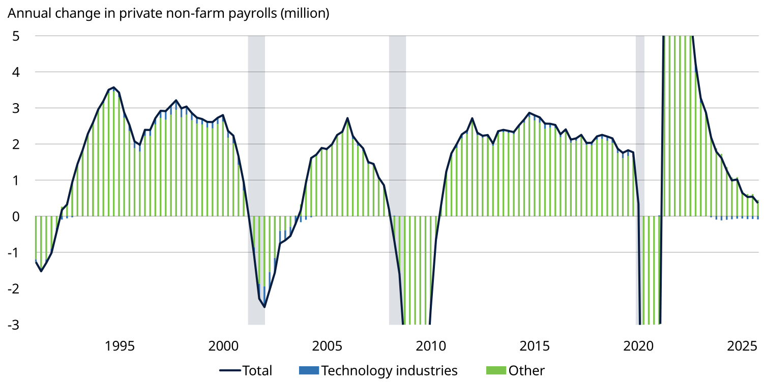 Ontslagen in technologiesector verklaren slechts een fractie van de afkoelende banengroei in de VS
