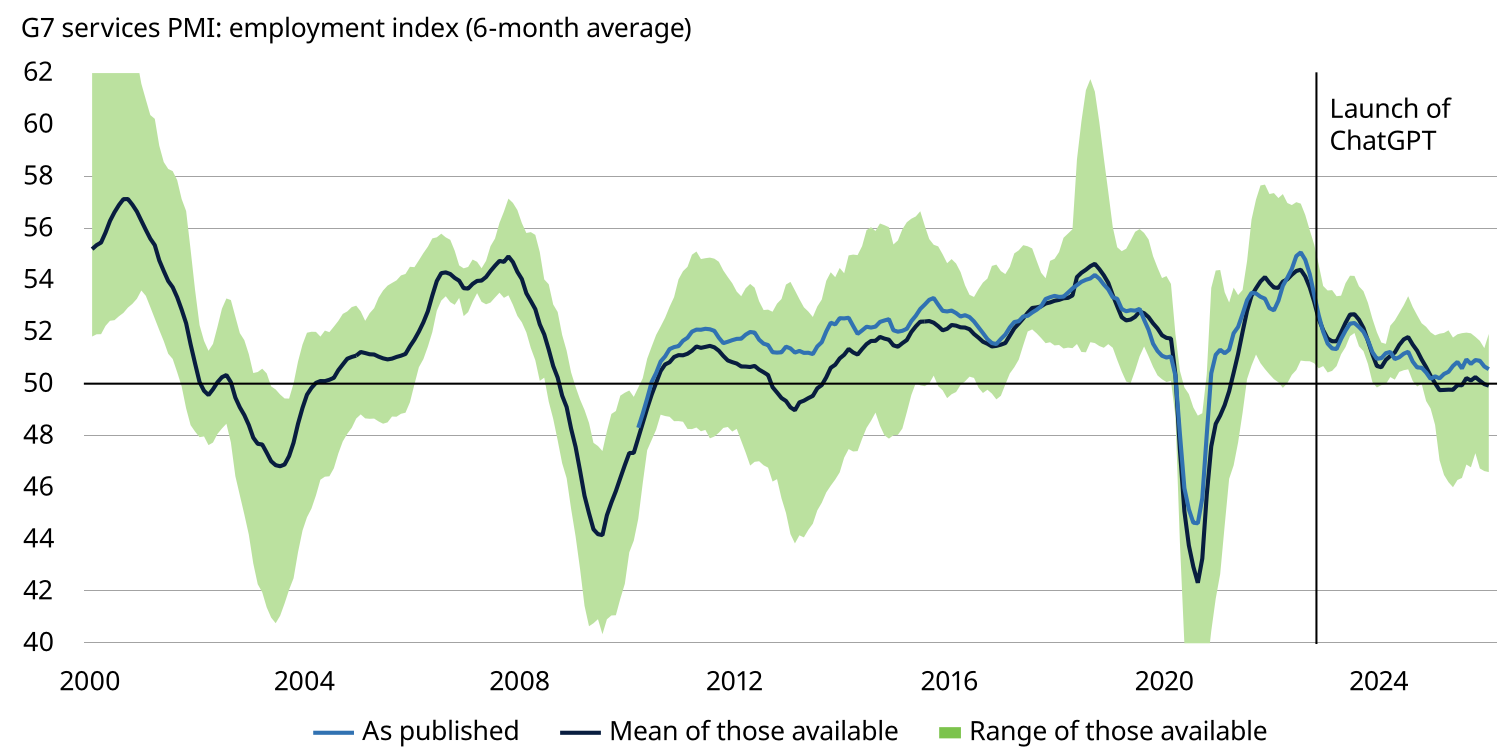 Als AI op betekenisvolle schaal werknemers zou verdringen, zou dat zichtbaar moeten zijn in een duidelijke verbetering van de arbeidsproductiviteit. Buiten de VS is daarvan echter geen overtuigende versnelling te zien. Dat suggereert dat de impact van AI op de arbeidsmarkten in de G6-landen tot dusver beperkt is geweest.