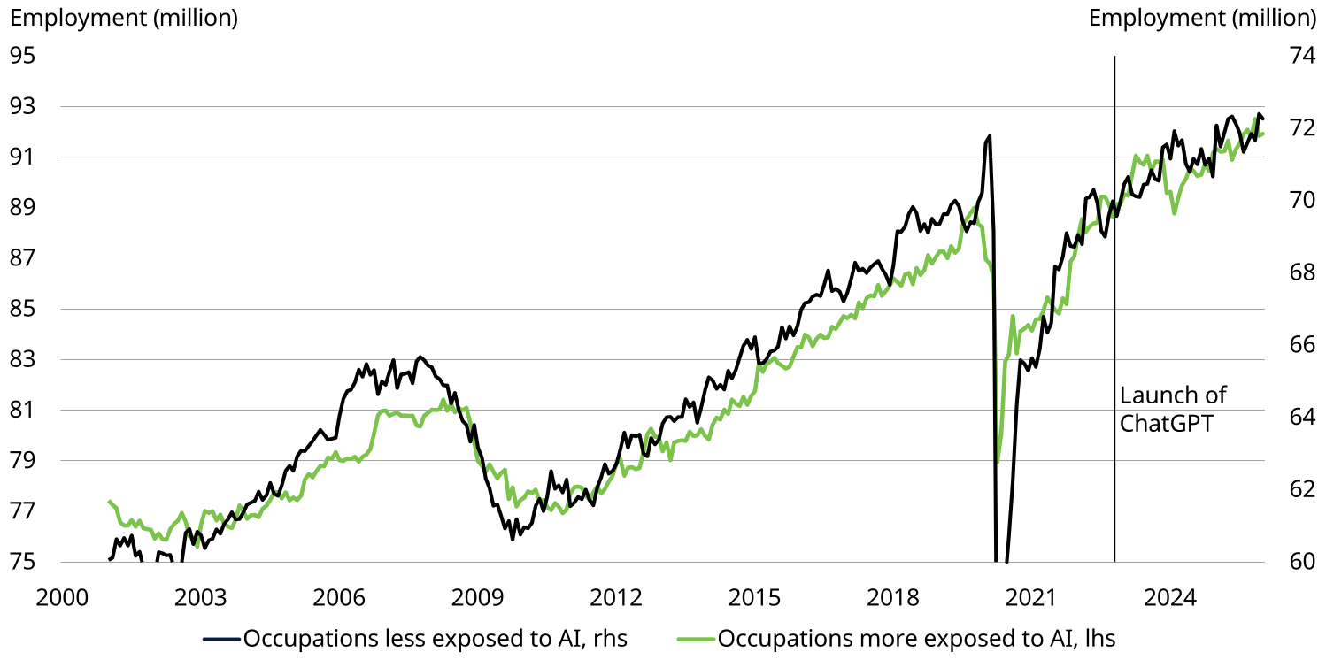 Hoewel vastgesteld kan worden dat AI niet heeft geleid tot grote aantallen ontslagen, kan het nog steeds zijn dat AI de banengroei breder in de Amerikaanse economie afremt. Maar een bottom-up-analyse van de blootstelling van beroepen aan AI laat zien dat er sinds 2022 weinig verschil is tussen banen die meer risico lopen om geautomatiseerd te worden en banen die minder risico lopen.